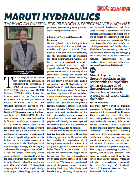 Maruti Hydraulics Ltd. is a trusted and leading manufacturer of construction equipments . We specialise in production of AAC Block plants, CLC Block Plants, Flyash Brick making machines, Concrete Block machines, paver block machines , Mobile Tower Lights and other construction industry machines. We take pride in our consistent and sustainable growth through the years, with all round satisfaction of our employees, suppliers and vendors and most importantly our Customers.